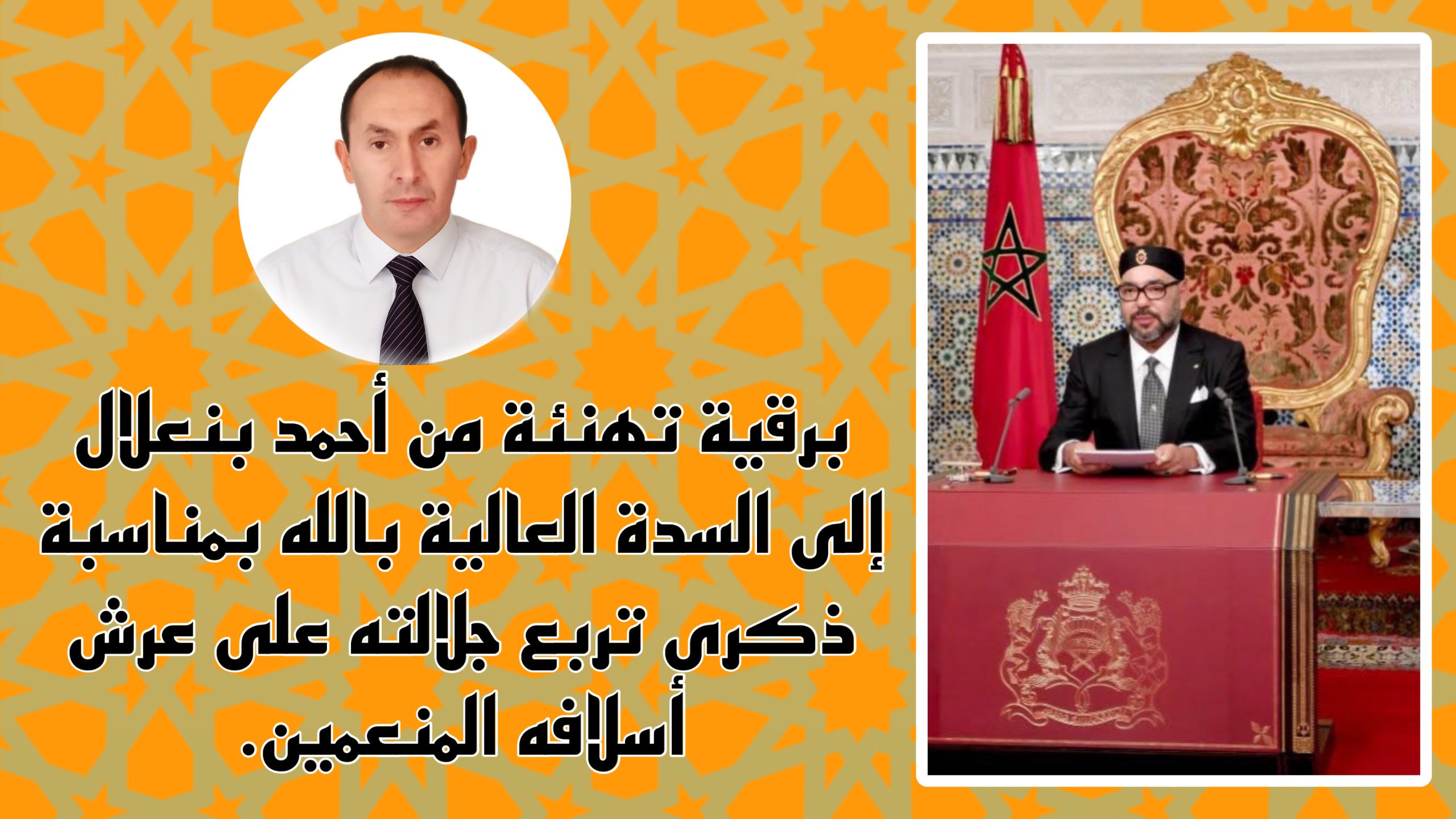بمناسبة تخليد الشعب المغربي الوفي، للذكرى المجيدة لتربع جلالة الملك محمد السادس نصره الله وأيده، على عرش أسلافه المنعمين، يتشرف خديم الأعتاب الشريفة، أحمد بنعلال، رئيس جماعة جبل لحبيب إقليم تطوان بأن يرفع إلى السدة العالية بالله، أسمى عبارات التهاني والتبريك، مقرونة بأصدق مشاعر المحبة والوفاء والإخلاص.